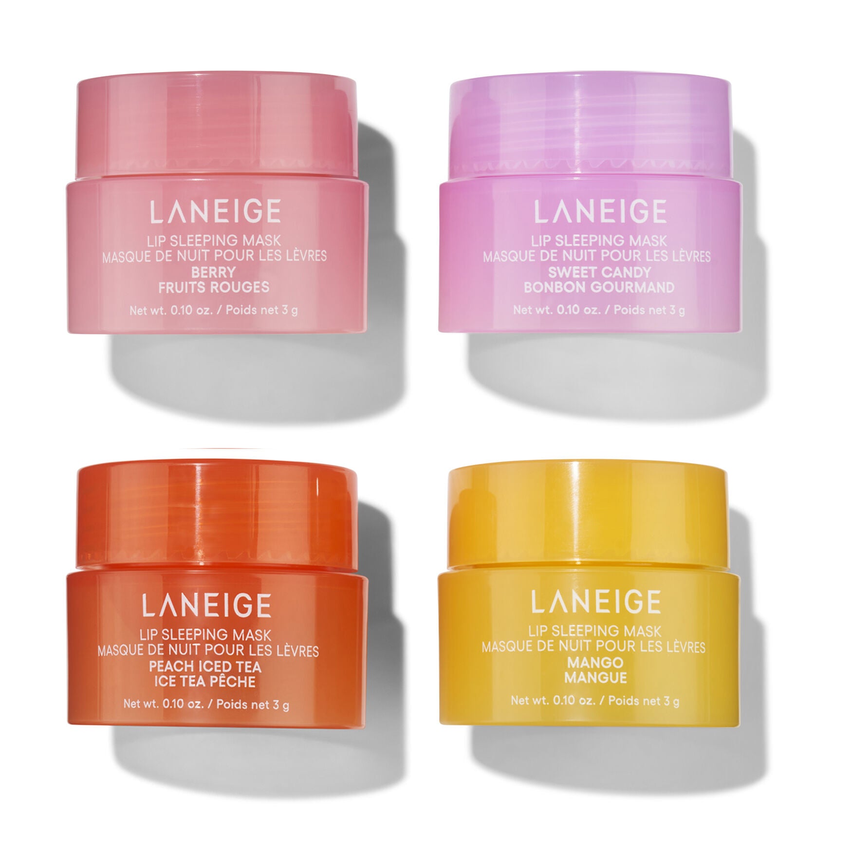 This skincare set features lip sleeping masks that deliver luxurious lip care in mouth-watering berry, mango, sweet candy and peach iced tea flavours. Formulated with a berry fruit complex of pomegranate, grape and raspberry juices, the mask performs a conditioning action to help leave the lips healthy and free from flaking and cracking.
